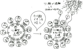 (作物の根の伸長阻害が極めて強いアルミニウム特に火山灰土壌では活性アルミニウムを抑える土壌改良効果がある。アルミニウム根の伸長を阻害)